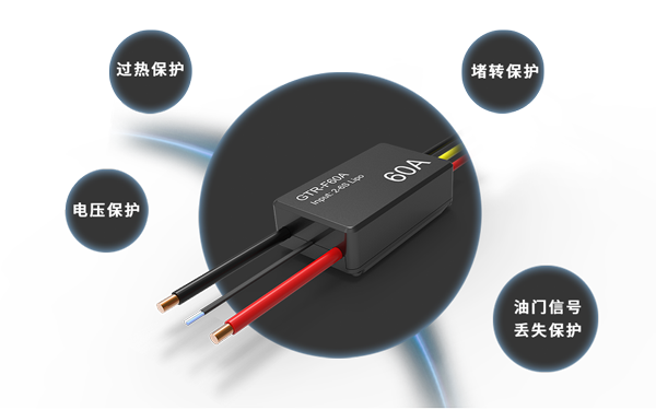 確保電調長時間穩定工作具備電壓保護/過熱保護/油門信號丟失保護/堵轉保護等多重保護功能,
